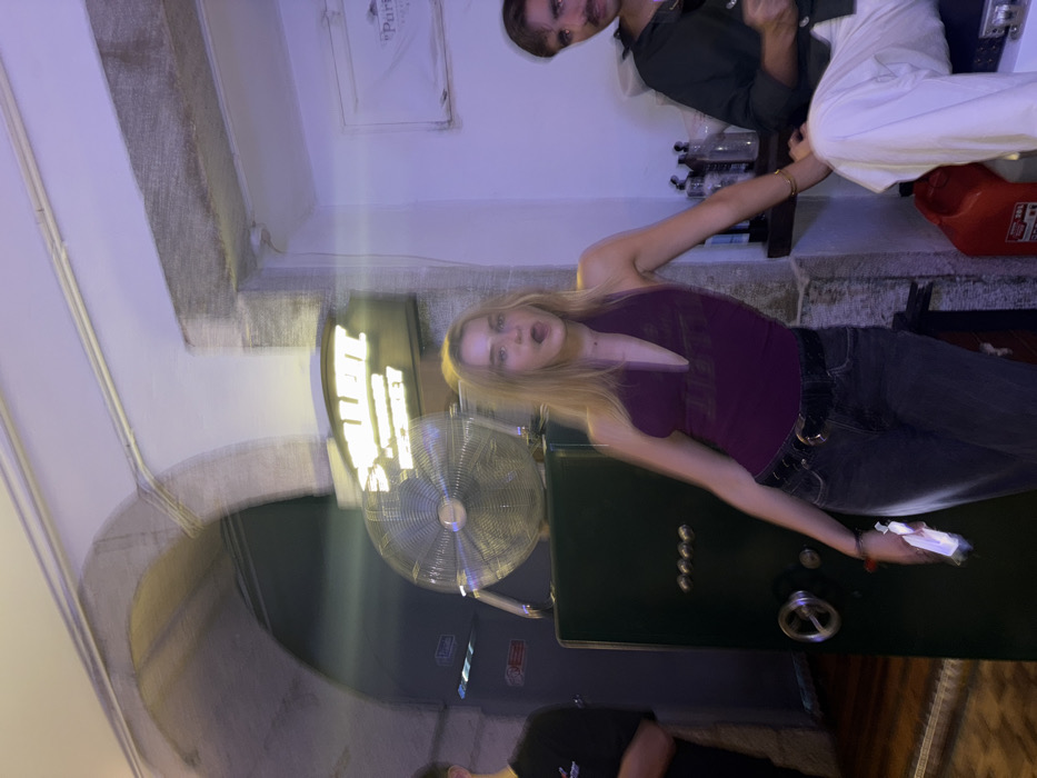 This image depicts an indoor scene at the Pallet Bar in Lisbon, Portugal, characterized by low, purple-blue ambient lighting and a slight motion blur. A young woman with long blonde hair and fair skin stands in the central foreground, facing the viewer. She wears a dark purple, deep V-neck halter top and dark-colored jeans with a black belt. Her mouth is open, with her tongue visible, as she looks forward. Her left hand holds a small white object, and her right arm is bent at the elbow, resting against an unseen surface to her right. To the woman's right, partially visible, is a seated man with dark hair and a mustache. He wears a dark shirt and light-colored trousers. On the far left, another man in a dark shirt is partially visible. The background features a large, dark green metal cabinet or safe with a prominent circular handle and four smaller knobs, located behind the woman. Above this cabinet, a large, metallic industrial fan on a stand is visible. Directly above the fan, a bright yellow neon sign clearly displays the words "PALLET" and "WHISKEY." To the far left, a stone archway recedes into a darker, undefined space. The right side of the frame shows a white wall with visible stone elements and a dark shelf holding several bottles and containers. A red plastic canister, resembling a fuel container, rests on the floor below the shelf. A partially obscured white sign is affixed to the upper right wall. The architectural style, including stone arches and plaster walls, is consistent with commercial establishments in historic urban districts.