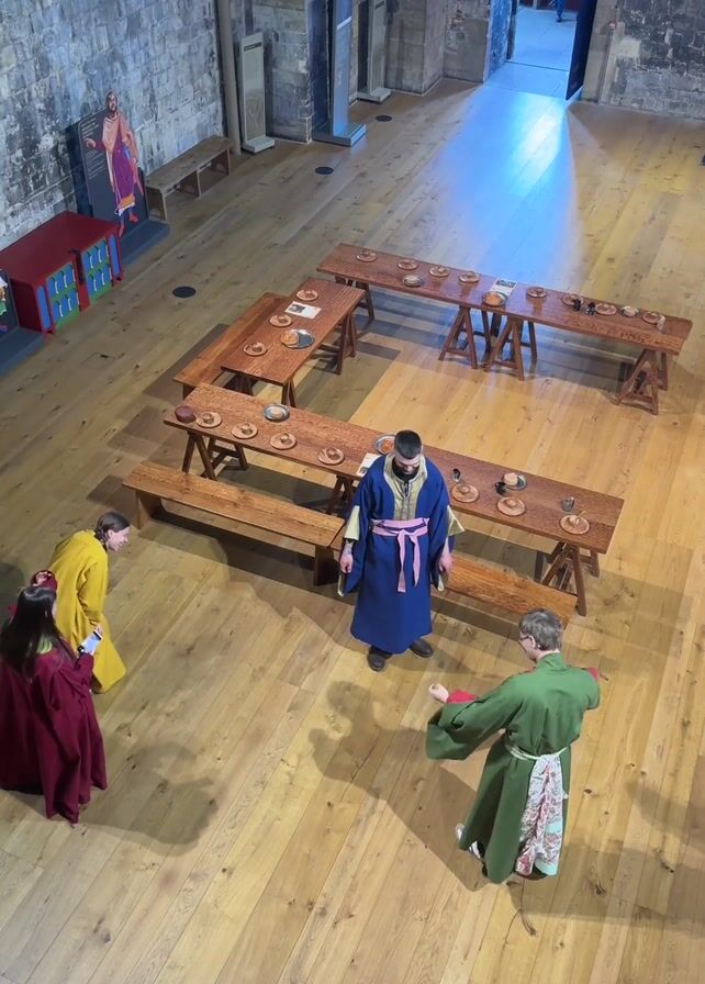 Here's a detailed description of the video: The video shows four individuals standing in a large, open hall. The hall has wooden floors and stone walls. There are four long wooden tables arranged to form a square, each set with wooden plates and small cups. The individuals are dressed in robes of different colors: one in yellow, one in red, one in blue with a pink sash, and one in green with a patterned underskirt. The person in the blue robe appears to be leading or addressing the others, gesturing with open arms. The other three face the person in blue. In the background, there is a brightly colored cabinet against one wall and a poster of a figure. A hallway is visible through an open doorway, with a person sitting in the distance. The camera is positioned above, providing a birds-eye view of the scene.