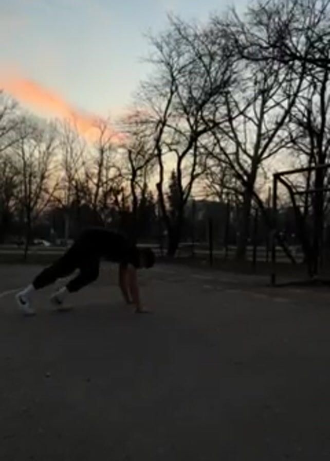 A person is doing a handstand in an outdoor park setting. They are wearing black clothing and white shoes. The ground is asphalt, and there are trees with bare branches visible in the background. A soccer goal is seen to the right. The sky is transitioning between day and night with a colorful sunset.