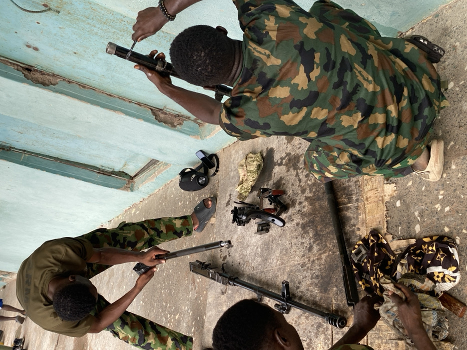 - "Three individuals are engaged in weapon maintenance on a concrete surface in Zaki Biam, Nigeria, positioned against a light-blue painted building wall exhibiting significant wear and paint deterioration" by FM-Ff9pr2, licensed under CC BY 4.0