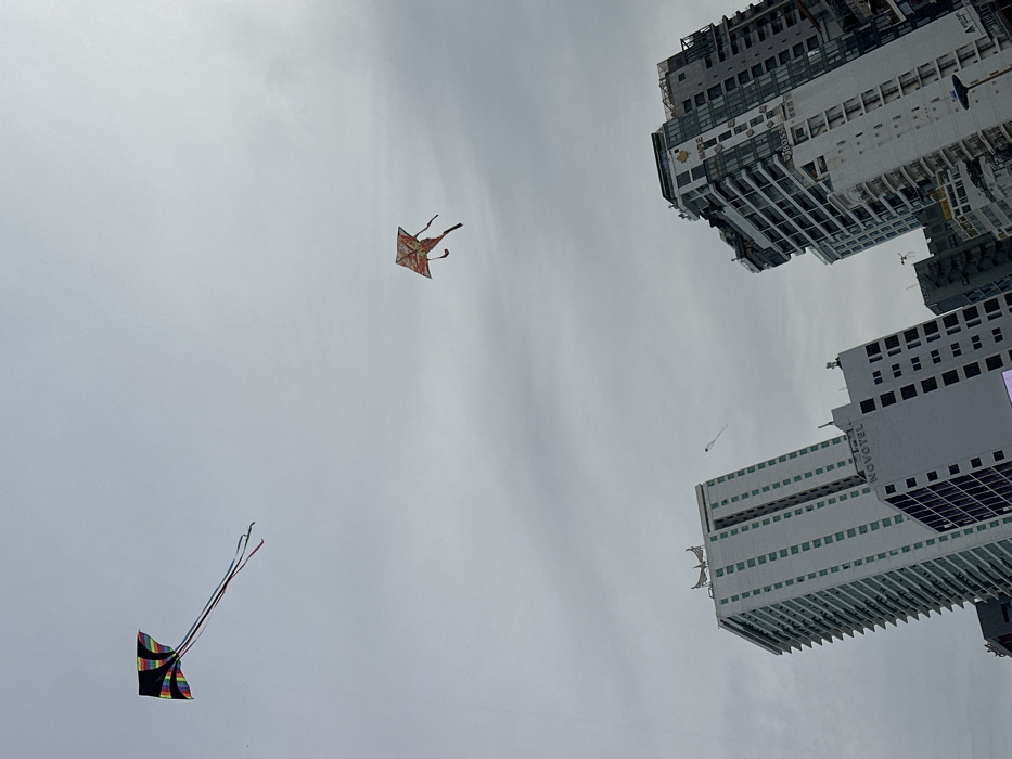 An upward-angled view captures an overcast sky above Nha Trang, Vietnam, populated by three kites and framed by high-rise urban architecture