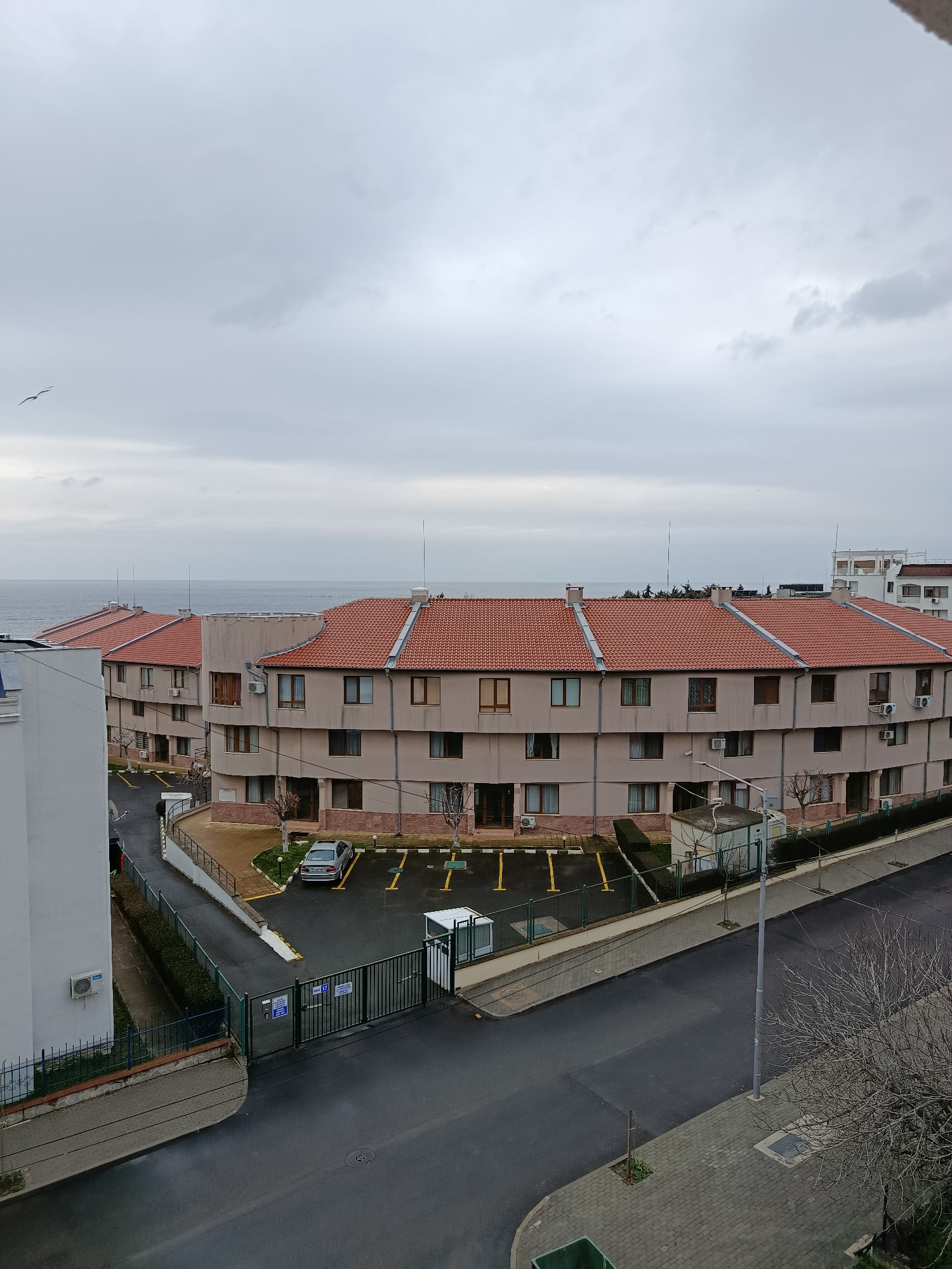 The image depicts an elevated view of a residential or hotel complex in Ravda, Bulgaria, under an overcast sky. The foreground shows an asphalt road with a grey paved sidewalk to the right. A large bare tree stands on the sidewalk. To the left, a multi-unit building complex with light brown facades and terracotta-tiled, pitched roofs is visible. This complex is arranged in a semi-circular or curved configuration, with three discernible stories for most units. Features include numerous brown-framed windows, external air conditioning units, and a distinctive cylindrical section on one building. Lightning rods protrude from the rooftops. The complex includes a gated entrance with green metal fencing, leading to an asphalt parking area marked with yellow lines. One silver sedan is parked within the lot. A small white guard booth or utility structure is positioned near the gate. Landscaping consists of small trees, some bare, and trimmed hedges bordering the property. Beyond the buildings, the calm, grey expanse of the Black Sea stretches to the horizon. Small specks, potentially birds, are visible over the distant sea surface. A lone seagull is captured in flight in the upper left portion of the cloudy sky. To the far right, a section of a taller white building is partially visible in the background, contrasting with the main complex. No individuals are present in the scene.