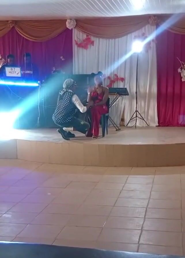 The scene is indoors, with a man kneeling and proposing to a seated woman on a small stage