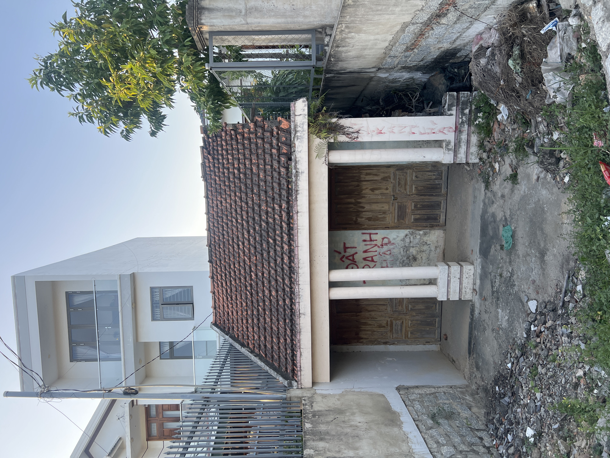 This image captures a street-level view in Diên Khánh, Vietnam, focusing on a dilapidated single-story structure. The building features a weathered, reddish-brown tiled roof and a front facade with two sets of light brown wooden double doors, flanked by two white, fluted columns supporting a shallow overhang. Red graffiti, including the Vietnamese text "ĐẤT TRANH HỢP", is present on the wall above the doors, with additional red marks on the right column. The immediate foreground consists of a concrete surface in front of the doors, partially covered with loose debris, including small rocks, broken concrete, and a green plastic bag. To the left, a light-colored concrete retaining wall shows signs of cracking and discoloration. To the right, another concrete wall borders an accumulation of refuse, composed of dry brush, plastic bags, and miscellaneous waste. Green foliage, resembling ferns, hangs from the right side of the roof's overhang. In the background, a modern, multi-story white building with glass balconies and large windows is visible to the left, separated by a gray metal picket fence. A utility pole with overhead wires stands in front of this modern structure. To the right, a large green tree with dense foliage is silhouetted against a clear, light blue sky, with a dark gray metal gate partially visible beneath it. No individuals are depicted in the scene.