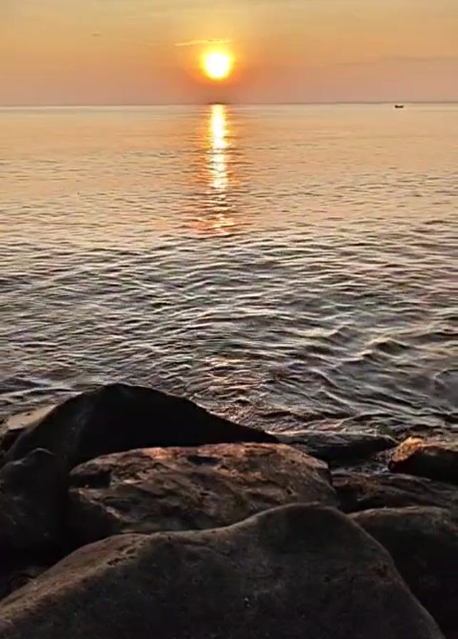 sunset over the ocean. In the foreground, there are dark, rounded rocks. The water is calm with small waves reflecting the sunlight. The sun is setting on the horizon, creating a bright line of light on the water's surface. In the distance, a small boat is visible. The sky is a gradient of orange and yellow, indicating the time of day.