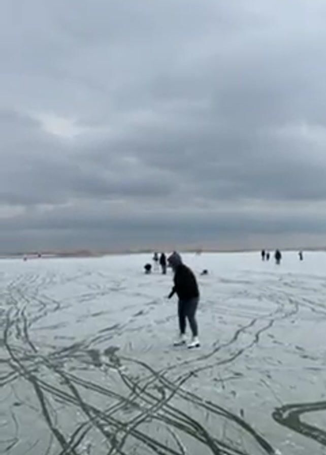 woman ice skating on a frozen lake or large body of water. The ice is covered in skate marks. Other people are visible skating or walking in the distance. The sky is overcast. The woman is wearing dark clothing and white skates. She starts off looking down, then looks up and smiles. Another person skates near her.