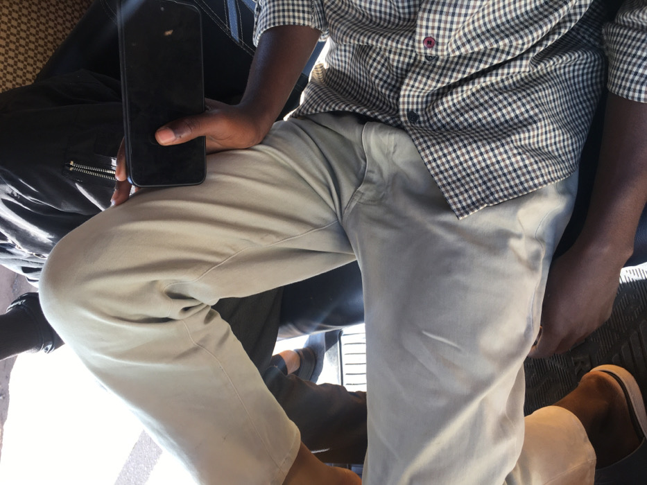 An overhead view captures a scene in Jos, Nigeria, featuring three individuals in close proximity. A person wearing a brown and white checkered long-sleeve shirt holds a black smartphone horizontally in their right hand, resting it on the thigh of another individual. This second person wears light beige trousers, with their leg bent and positioned over the partially visible leg of a third individual, who wears dark clothing and dark brown shoes with light soles. The bare right foot of the person holding the phone is visible at the bottom of the frame. Bright natural light illuminates the subjects from the left, revealing a dark surface and vertical grate-like elements in the background, indicative of a confined interior space such as a vehicle or waiting area.