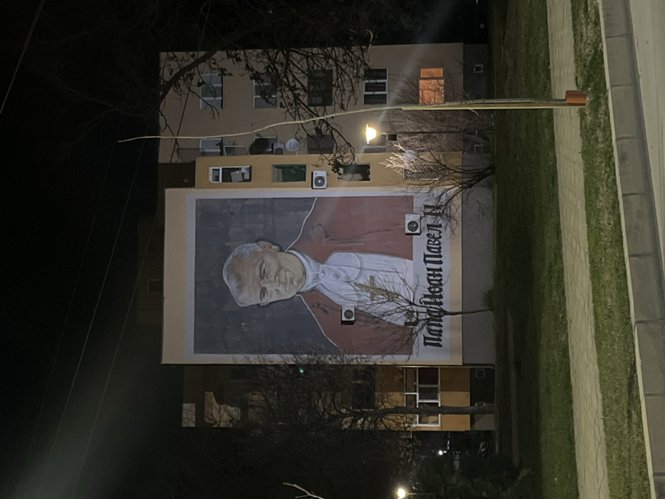 The image displays a nighttime scene in Rakovski, Bulgaria, focusing on a multi-story residential building. The central subject is a large mural painted on the side of the building, depicting Pope John Paul II from the chest up, facing slightly left with a subtle smile. He is rendered with grey hair, wearing a white cassock, a red mozetta, and a pectoral cross. Below the portrait, Cyrillic text translates to "Pope John Paul II". Several white external air conditioning units are affixed to the building's facade, two of which are positioned directly over the mural. The building itself is light beige/brown with multiple windows, some illuminated from within. Bare deciduous trees are scattered in the foreground and mid-ground, suggesting a colder season. The immediate foreground features a strip of green grass, a concrete curb, and grey pavement. Two modern streetlights are visible, one prominently in the mid-ground on the right, casting light on the scene. The sky is dark, indicating night, with faint power lines discernible at the top. No individuals or active subjects are present.