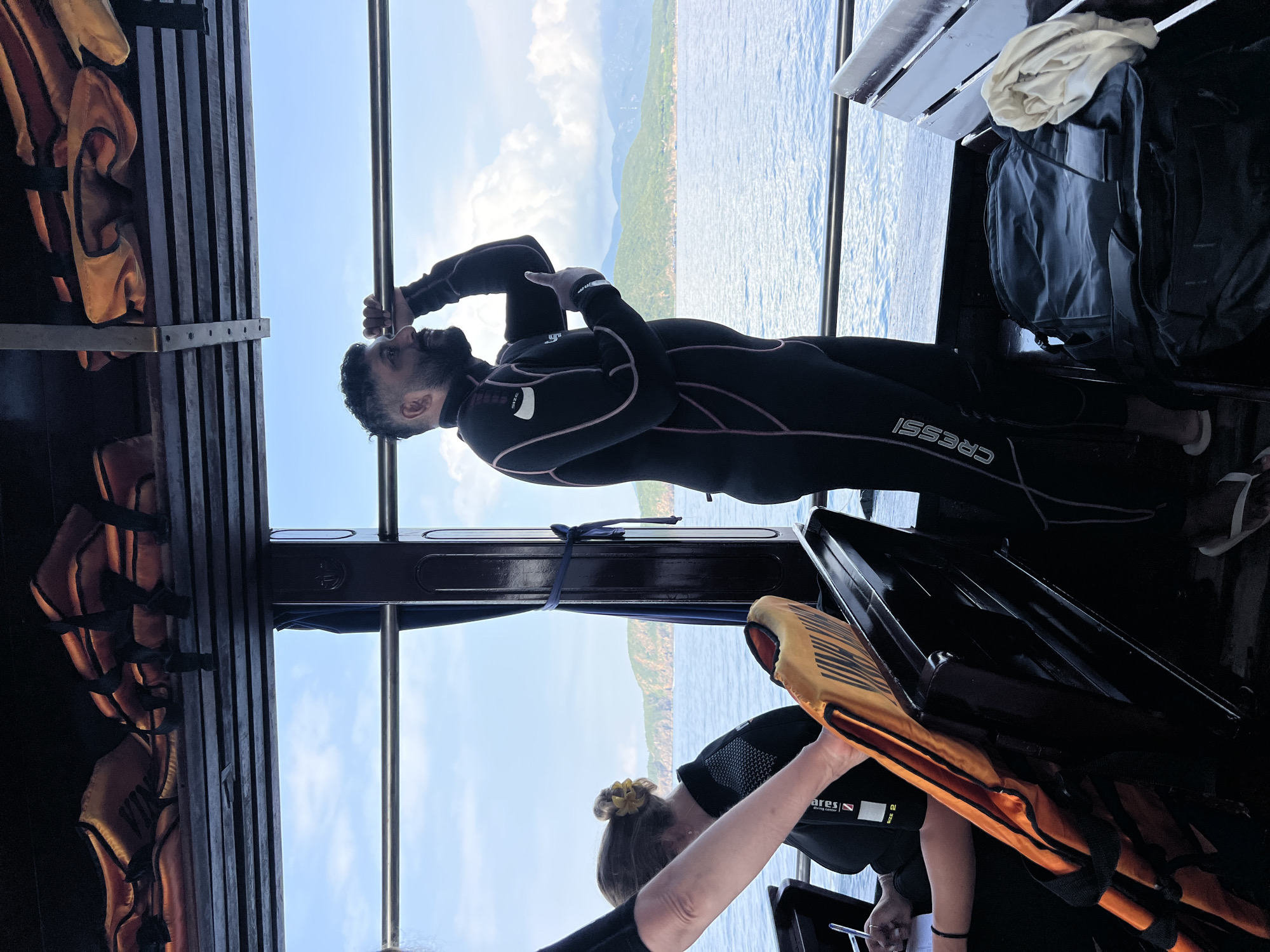 - "Onboard a vessel, a man in a black and pink wetsuit adjusts his goggles, facing the sea" by FM-1FgIL2, licensed under CC BY 4.0