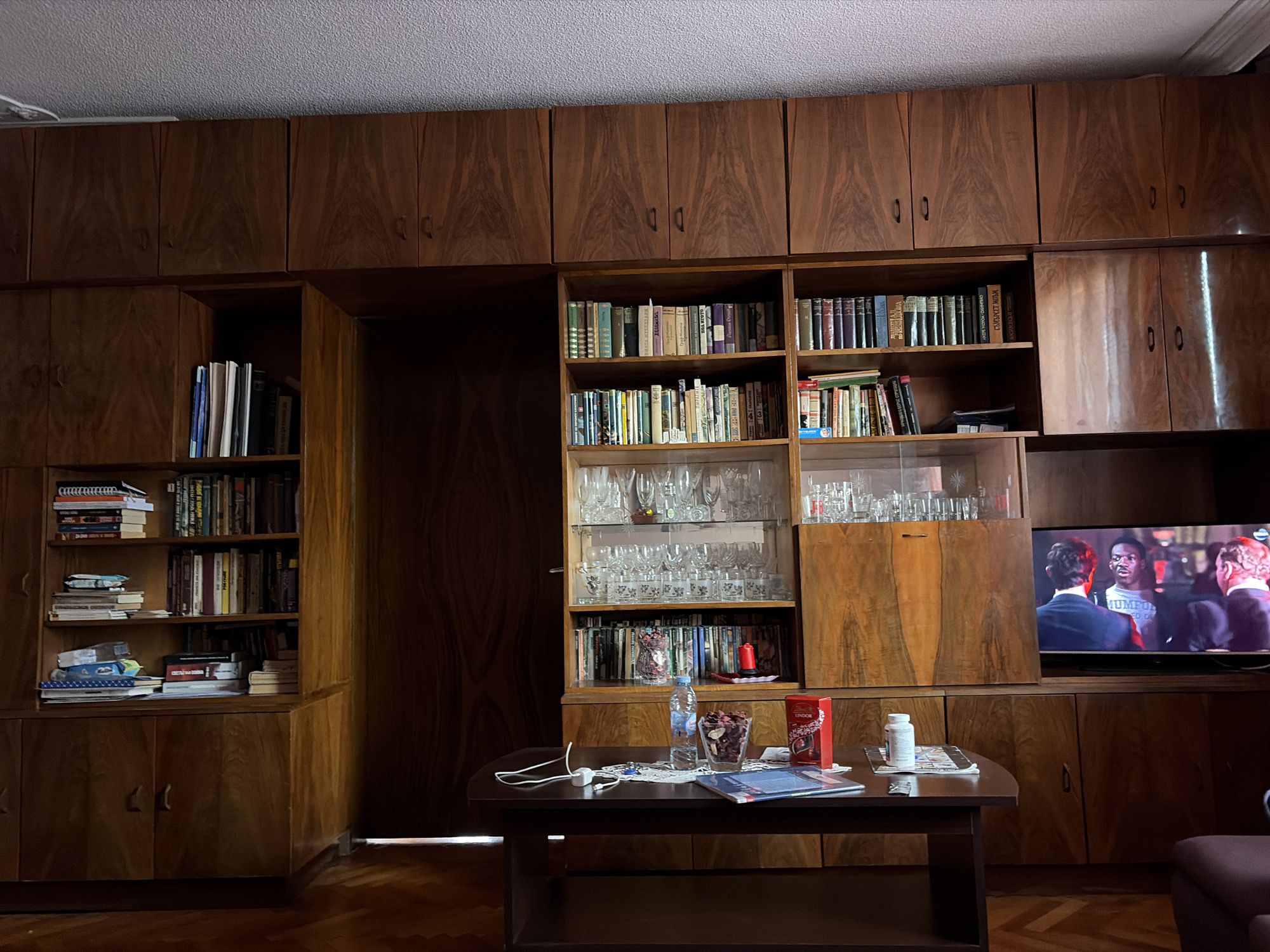 n interior scene in Vidin, Bulgaria, featuring a large, built-in wooden cabinet dominating the background. The cabinet contains shelves filled with books and glassware. In the lower right section is a television screen displaying a scene with multiple people. In the foreground, a dark wooden table holds various objects, including a water bottle, a jar of something reddish, a box of chocolates, a book, and a pill bottle. The floor is covered with wooden parquet. The lighting in the room is somewhat dim.