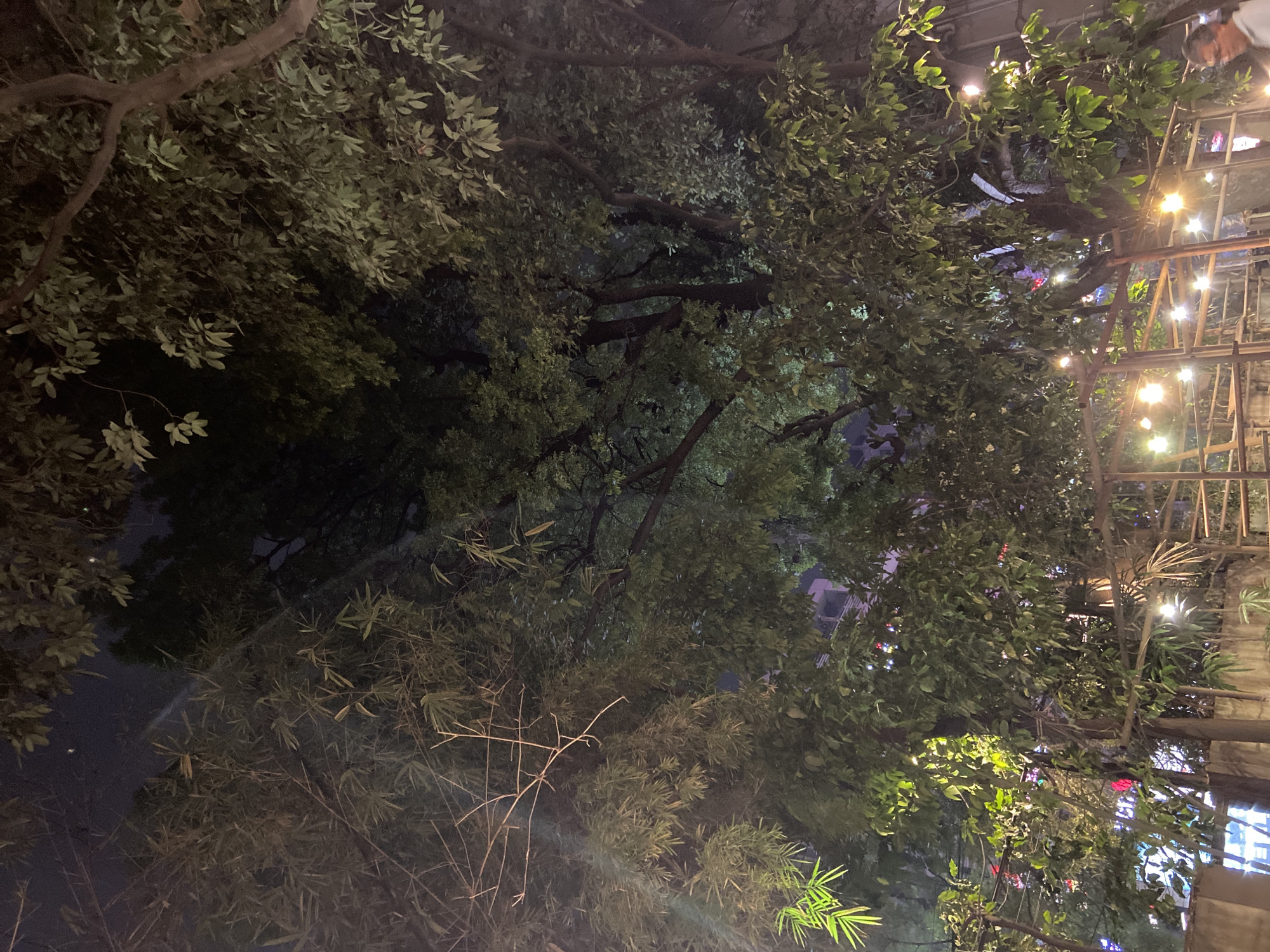 The image depicts a nighttime scene in an outdoor urban setting, likely in Dhaka, Bangladesh, based on the architectural style and lighting. Trees with dense foliage are prominent, obscuring much of the background. Artificial string lights are visible, adding to the ambient illumination. The environment suggests a restaurant or cafe with an outdoor seating area, where structures made of wood are visible. The overall impression is one of a relaxed atmosphere in a city environment.