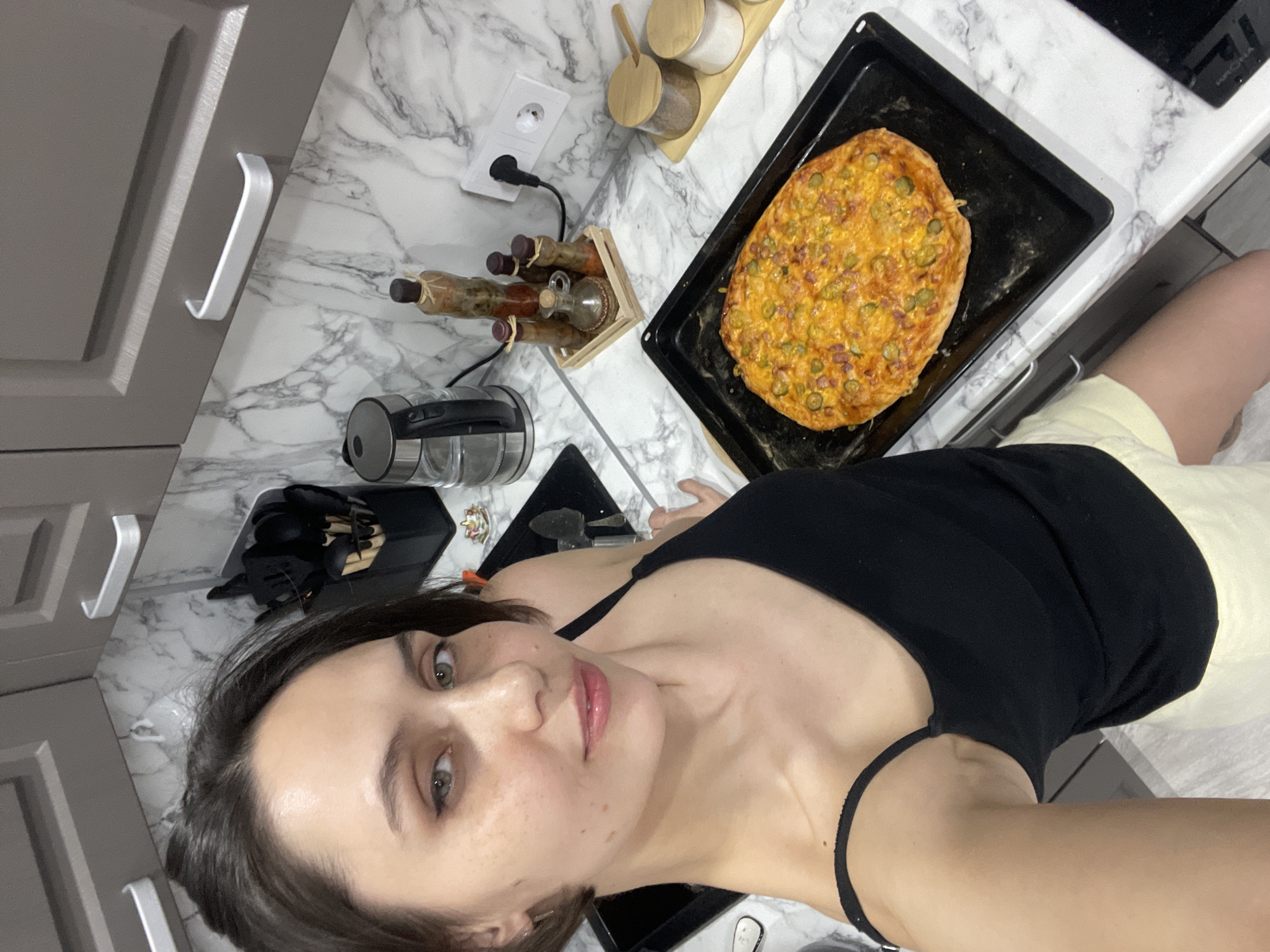A woman with short brown hair and green eyes is taking a selfie in a kitchen. She is wearing a black top. A pizza on a black baking sheet is on the countertop. The kitchen has gray cabinets with silver handles and a marble countertop. The countertop also has a glass electric kettle, cooking utensils in a black holder, jars of spices, a wooden box with bottles, and an electrical outlet. The location cannot be determined, but the subject is in a kitchen.