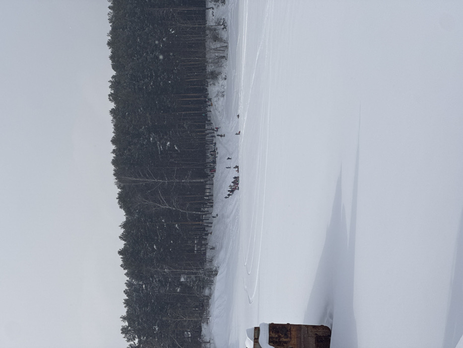 An outdoor scene captured in Chaikovsky, Russia, depicts a winter landscape, likely along the Votkinsk Reservoir embankment. The foreground consists of a vast, flat expanse of snow-covered ice or ground, exhibiting subtle track marks. In the lower-left quadrant, a partially snow-covered, rust-toned, rectangular structure, possibly concrete or metal, extends from the frame. The mid-ground features a snow-covered slope that ascends towards a dense forest line dominated by dark evergreen trees, interspersed with several lighter-barked deciduous trees. Numerous individuals, appearing as small figures, are present on the slope, engaged in winter recreational activities. Several figures are actively sliding down the incline on sleds or tubes, while others are grouped at the base of the slope or in the process of climbing it. The sky above is uniformly overcast and light grey, consistent with a winter day, with faint indications of light snowfall visible against the darker trees.