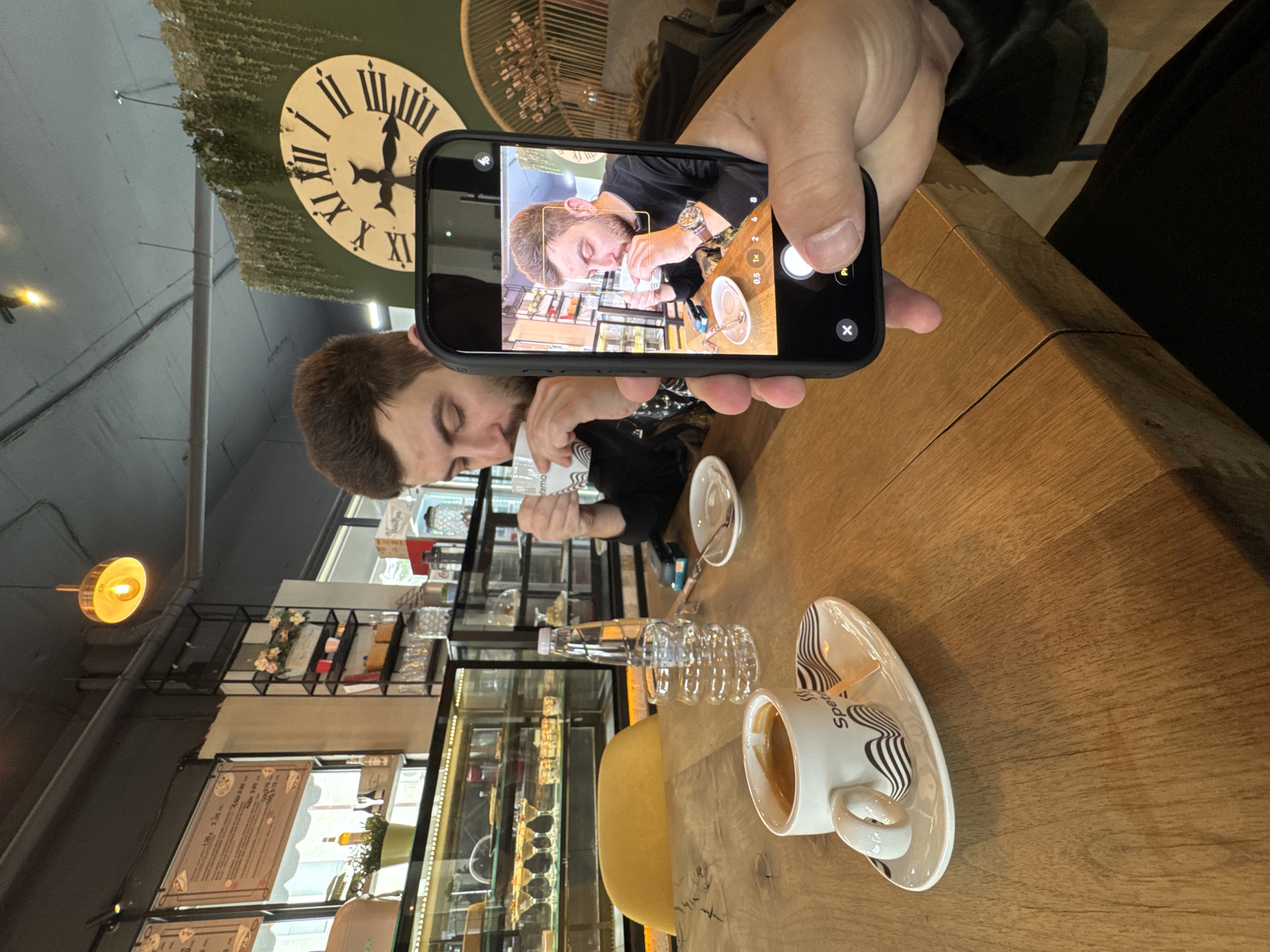 The image depicts an indoor scene within Spets Caffee & Bakery in Varna, Bulgaria. The central focus is a light brown wooden table. In the immediate foreground, a right hand, clad in a black long-sleeved garment, holds a black-cased smartphone vertically. The phone's screen displays a live camera feed of the man seated opposite, featuring a yellow focus box around his head. A white ceramic cup, marked with "Spets" and a black wavy pattern, containing a dark liquid (presumably coffee), rests on a matching saucer with a small wooden stirring stick on the table. A young adult male, with short brown hair and a beard, is seated at the table, wearing a black long-sleeved shirt and a watch with a brown strap on his left wrist. He is actively drinking from a white cup, holding it with both hands. Positioned near his hands on the table are a clear glass water bottle, an empty small white saucer with a spoon, a blue cigarette lighter, and a small pack of cigarettes. The background details a cafe environment. To the left, a lit glass display case exhibits multiple desserts, including tarts and layered drinks in martini glasses. Above this, a window allows ambient light, and menu boards with Bulgarian text and prices in Bulgarian Lev (e.g., "1.70 лв", "2.35 лв") are visible on the wall. To the right, a large circular clock with black Roman numerals on an off-white face is mounted on a dark green wall, displaying a time near 11:55 or 12:55. Artificial green foliage hangs from the ceiling near the clock. A black metal shelving unit with potted flowers and other items is present. The ceiling features exposed dark pipes and a brass-colored pendant light.