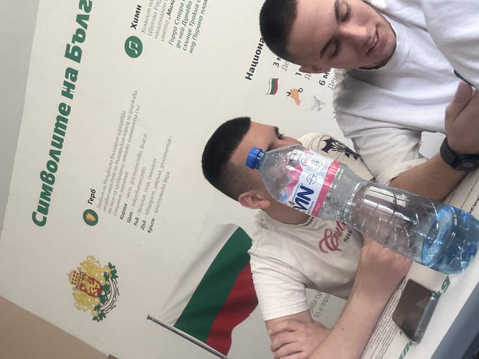 The image depicts an indoor scene in Kozloduy, Bulgaria, featuring two young men seated at a light-colored table against a wall adorned with a large informational poster. The poster, titled "Символите на България" (Symbols of Bulgaria) in green text, displays the Bulgarian Coat of Arms in the upper left, a Bulgarian national flag, and text in Bulgarian describing national symbols like the coat of arms (Gerb) and anthem (Himn), alongside numerical references to national holidays. In the foreground, a transparent plastic DEVIN mineral water bottle with a blue cap stands on the table, containing approximately one-quarter volume of light blue liquid. To the left of the bottle, a dark-colored smartphone rests flat on the table, its screen dark. The individual on the left, partially visible from the chest up, wears a light-colored t-shirt with a graphic design and has a short, dark buzz cut. His left arm is bent, resting on the table, and he looks downwards. The individual on the right, also partially visible, wears a plain white t-shirt, has a similar short, dark buzz cut, and a dark smartwatch on his left wrist. He looks downwards and slightly to his right, exhibiting a faint smile. Both individuals appear focused on an unseen object or activity at the table.
