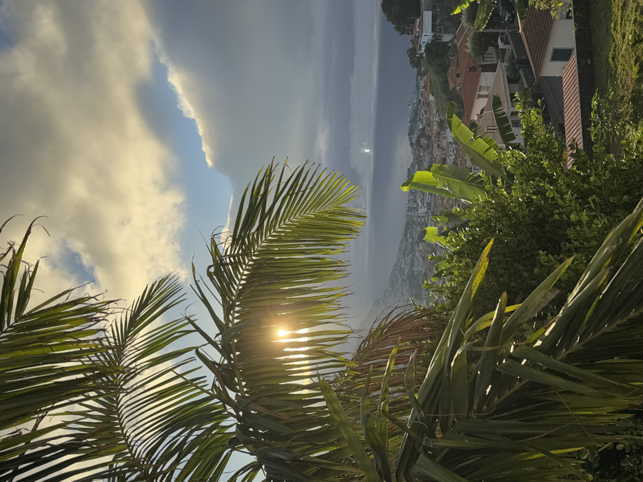 The image depicts an elevated view of the city of Funchal, Portugal, extending down a hillside to the Atlantic Ocean. In the immediate foreground, large, vibrant green palm fronds partially obscure the upper left and top of the frame. Sunlight filters through these fronds from the left, creating a distinct starburst effect. Below the palm foliage, dense green shrubbery and broad-leafed plants are visible, illuminated by the low sun. The midground reveals a sprawling urban landscape composed primarily of residential buildings with terracotta-tiled roofs and light-colored facades, interspersed with roads and smaller patches of greenery. This cityscape descends towards the coastline. The background features the Atlantic Ocean, presenting a dark blue-grey hue under a partly cloudy sky. A bright, vertical sun glint is visible on the distant ocean surface. The sky exhibits a mix of light, illuminated cumulus clouds and darker, heavier cloud formations towards the horizon, with patches of clear blue sky visible. The overall lighting suggests either early morning or late afternoon. No people or animals are present in the scene.