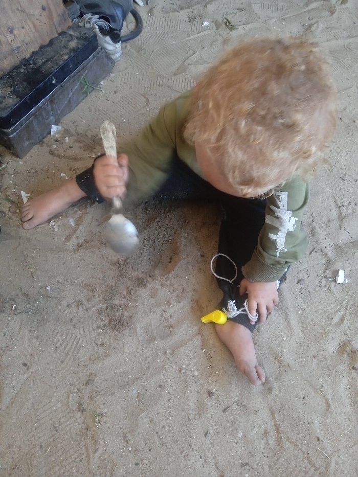 An overhead perspective shows a young child with blonde, curly hair sitting on a sandy surface in the city of Al-Mawasi, Unknown. The child is dressed in an olive-green long-sleeved shirt featuring a white graphic on the left sleeve and black pants, with bare feet visible. The child's right hand grasps a large, ornate silver-colored spoon, which is partially embedded in the sand. A yellow plastic whistle is tied to the child's left ankle with a white string. In the upper left quadrant of the frame, a black rectangular metal container holding dark debris is visible, alongside portions of a black hose or cable and a white object. The sandy ground exhibits footprints and scattered small white fragments.