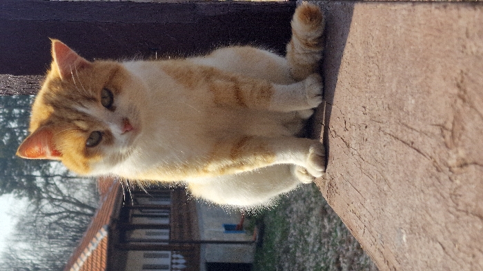 - "A bi-color domestic cat, predominantly white with ginger patches, is seated upright on a weathered, dark brown wooden beam" by FM-KFop22, licensed under CC BY 4.0