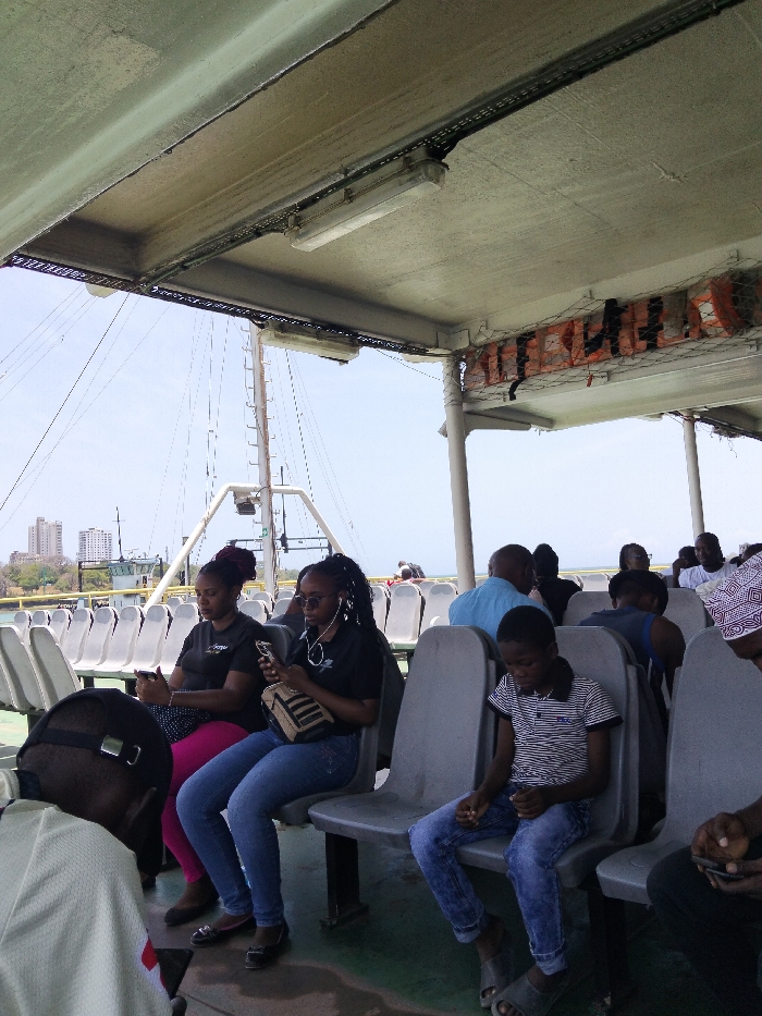 The image captures a scene aboard a passenger ferry or large boat, with coastal urban development visible in the background, consistent with Mkomani ward, Kenya