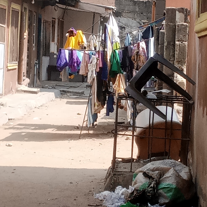 The image displays an unpaved residential alleyway in Ikorodu, Nigeria, under direct sunlight, indicated by pronounced shadows. The scene is devoid of people. In the foreground, on the right, a dark grey plastic chair is inverted atop a metal cage-like structure. Inside this structure, a white plastic container is visible. Adjacent to the base of the structure, a pile of refuse, including plastic bags and wrappers, is accumulated on the dirt ground. Dominating the midground is a clothesline system, constructed from metal rods, strung across the alleyway. Numerous articles of freshly washed clothing, in various colors including yellow, purple, blue, green, and multi-patterned fabrics, hang drying. The ground is light brown packed earth, with minor debris scattered. To the left, a series of light brown-walled residential structures with brown window and door frames line the alley. In the background, across the path, a building constructed of unplastered concrete blocks is partially visible. The alleyway recedes into the background, showing a slight elevation and what appears to be concrete steps further down the path.