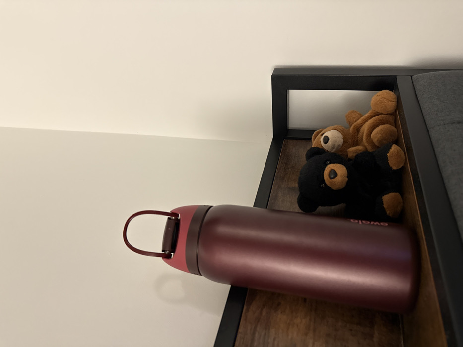 - "A burgundy Owala water bottle sits on a shelf alongside two teddy bears, one brown and one black" by FM-rSR2K3, licensed under CC BY 4.0