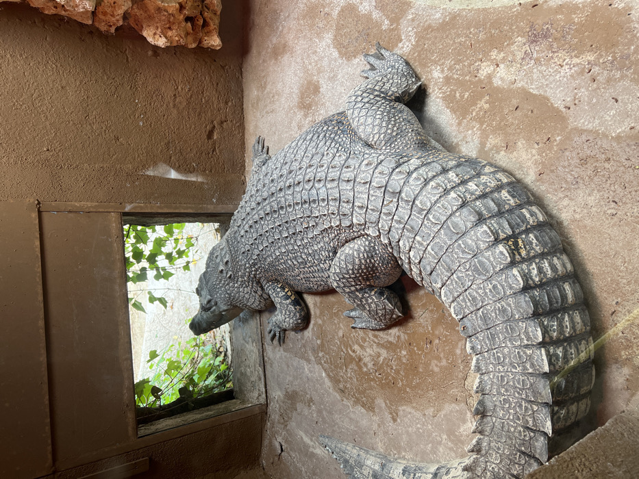 - "A large, robust crocodilian, exhibiting mottled grey and green scales, lies prone on a textured, light brown ground with several damp patches" by FM-f117B3, licensed under CC BY 4.0