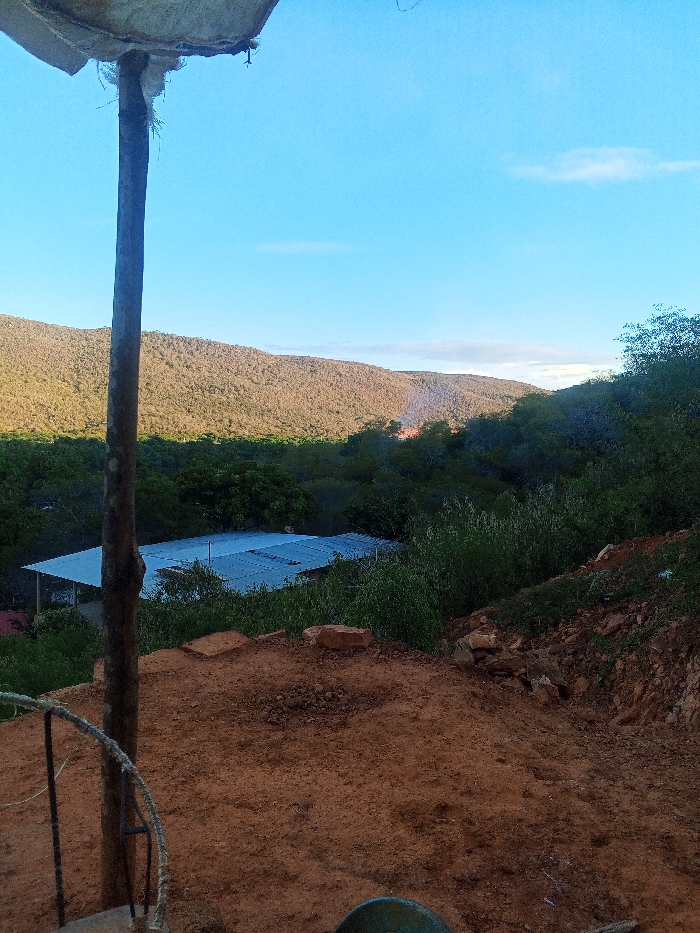 The image displays an outdoor scene in El Tacal, Venezuela, overlooking a valley with mountainous terrain. The immediate foreground consists of disturbed reddish-brown earth, showing signs of excavation or landscaping, with scattered rocks and a small mound of loose soil. A weathered wooden pole stands vertically in the left-center, extending from the lower frame upwards, supporting a frayed, light-colored fabric or tarp material overhead. A segment of a black metal spiral railing is visible at the bottom left. Partially visible at the very bottom right is a dark, rounded object. Below the foreground and across the midground, dense green vegetation, primarily trees and shrubs, covers the sloping terrain. Within this vegetation, a building with a light blue corrugated metal roof is discernible, positioned slightly to the left of the frame's center. The background is dominated by a large mountain range, covered in arid-appearing green-brown vegetation, bathed in sunlight. On the far right side of the distant mountains, a distinct plume of white smoke rises, indicating a localized burn or fire. The sky above is clear blue with minimal, scattered white clouds, primarily towards the horizon. No individuals or animals are present in the depicted scene.