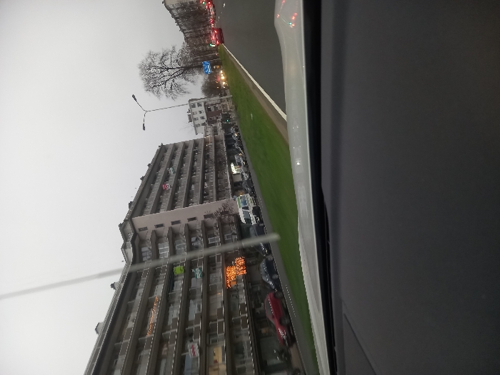 The image depicts an urban street scene on an overcast day, captured from the interior of a vehicle, with its dashboard visible at the bottom