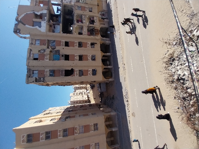 The image depicts a street scene in Khan Yunis, Palestinian Territory, under a clear blue sky. Two multi-story residential buildings frame the upper portion of the view. The building on the left appears largely intact but shows some damage and debris near windows. The building on the right exhibits extensive structural damage, particularly to its upper floors and facade, with large sections of concrete and walls missing, exposing interior rooms and structural elements. Windows are broken or missing throughout both buildings. A paved road occupies the mid-ground, featuring white lane markings and tire tracks on its unpaved shoulders. Scattered debris and rubble are visible on the unpaved ground areas next to the road, particularly in the foreground. Several individuals are walking on or alongside the road. A group of approximately five adults is moving from right to left in the middle of the road. Further left, another person in dark clothing walks on the unpaved shoulder, and a child in blue clothing is further down the street. In the foreground, two individuals in dark attire walk on the unpaved ground, one wearing an orange garment over dark clothing. In the background, between the two main buildings, more damaged buildings and rubble are visible under the clear sky.