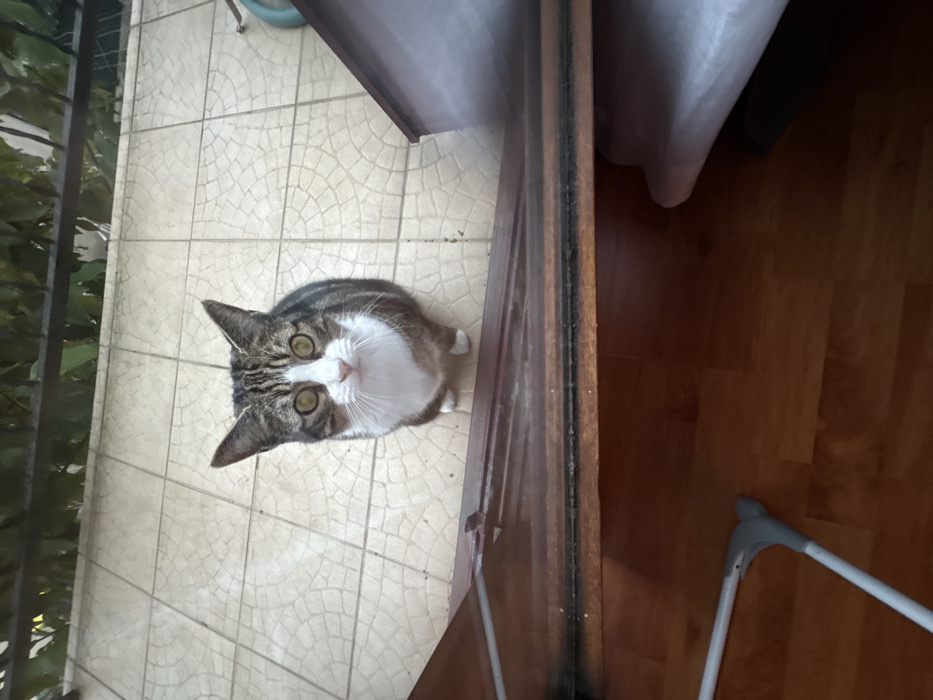 A domestic shorthair cat with a brown and grey tabby pattern, distinctive white chest, belly, muzzle, and paws sits upright on a light beige, patterned tiled surface. Its large, round eyes, appearing green-yellow, are fixated directly upwards at the camera. The scene is observed from inside a dwelling in Montreuil, France, looking out through a dark brown wooden threshold. The tiled exterior surface extends away from the threshold, revealing a dark metal railing partially obscured by green foliage in the upper background. A blue object, possibly a hose or cable, is visible on the tiles to the right, adjacent to a dark wooden structure. Inside, the immediate foreground displays a reddish-brown wooden floor. A grey and white metal object, consistent with a laundry drying rack, occupies the lower-left, while a light-colored fabric is partially visible on the floor in the lower-right.