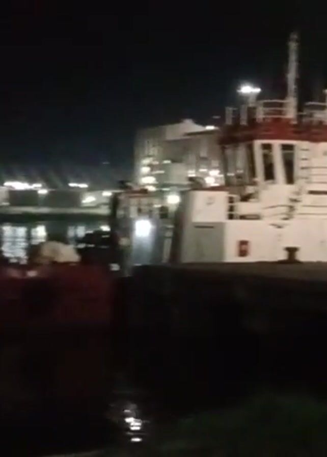 harbor at night. A white tugboat with a red roof is docked next to a concrete pier. Beyond the pier and the tugboat, a large ship or structure, possibly a tanker or oil rig, is visible in the distance, illuminated by numerous lights. The water reflects the lights, creating a shimmering effect. Some foliage is visible in the foreground, suggesting the camera is positioned near the edge of the pier or a grassy area. The night sky is dark, and the overall lighting is dim, highlighting the artificial lights.