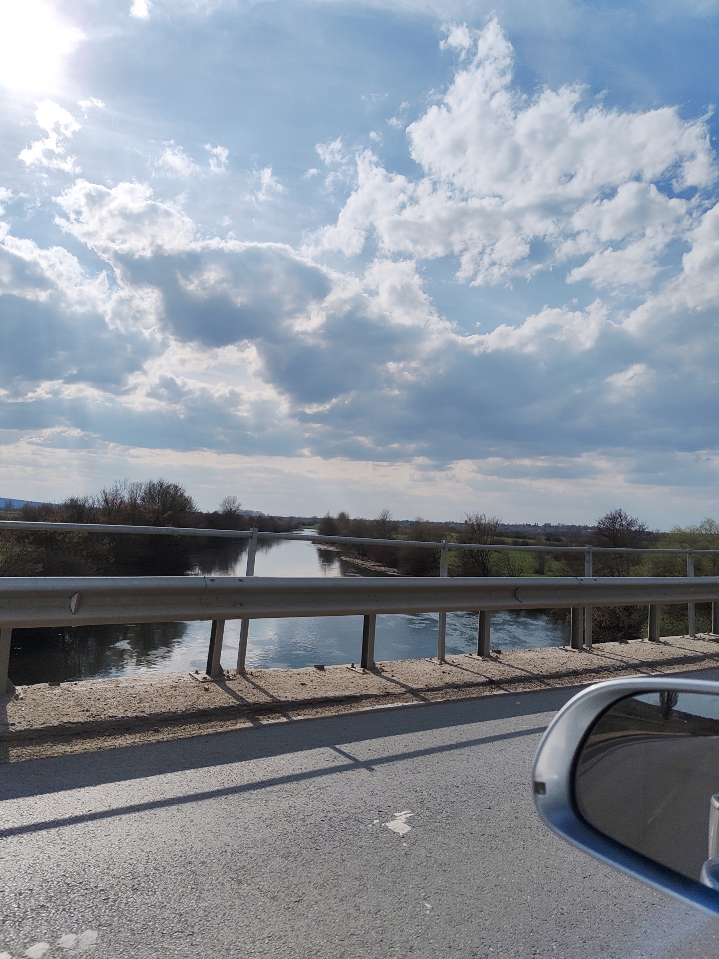 The image displays a landscape view captured from a bridge over a river, situated in the vicinity of Butan, Bulgaria. The upper portion of the frame features a partly cloudy sky with a bright sun visible in the upper left quadrant, creating visible sun rays. A river flows horizontally across the mid-ground, reflecting the sky and vegetation. Both banks of the river are lined with deciduous trees and shrubs exhibiting early spring foliage. Beyond the riverbanks, agricultural fields and distant terrain are visible, with a faint outline of a settlement on the far horizon to the right. In the foreground, a gray asphalt road surface with cast shadows from a bridge railing is present. A silver-colored metal guardrail, consisting of horizontal bars and vertical supports mounted on a concrete base, extends across the middle of the frame. The passenger-side rear-view mirror of a vehicle, silver in color, is partially visible in the lower right corner, reflecting a blurred segment of the road and possibly the vehicle interior. No individuals are depicted.