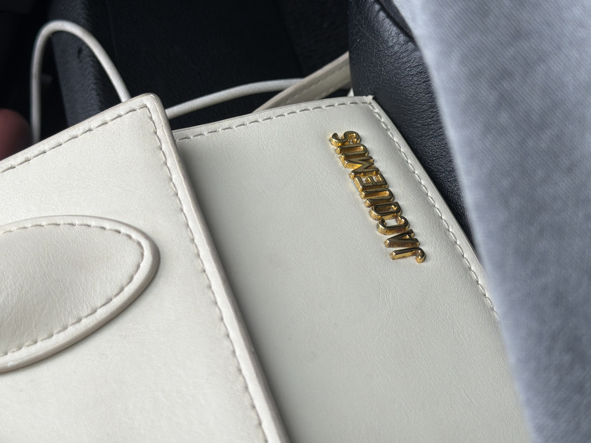 A white Jacquemus Le Chiquito-style handbag is depicted in a close-up, angled shot. The bag is made of textured white material, likely leather or faux leather, with prominent white stitching along its edges and flap. A small, gold-colored metallic "JACQUEMUS" logo is affixed to the lower front portion of the bag. A thin, white strap extends from the bag's upper right side. The bag rests partially on a dark, possibly black, textured surface consistent with automotive upholstery, such as a car seat. A portion of light gray, ridged fabric, possibly clothing, is visible in the lower foreground. The scene appears to be inside a vehicle, indicating the bag is being transported. No individuals are fully visible, though implied human presence is suggested by the bag's placement and the visible fabric. The specific location in the city of Moscow, Russia, cannot be determined from the visual information provided in the image.
