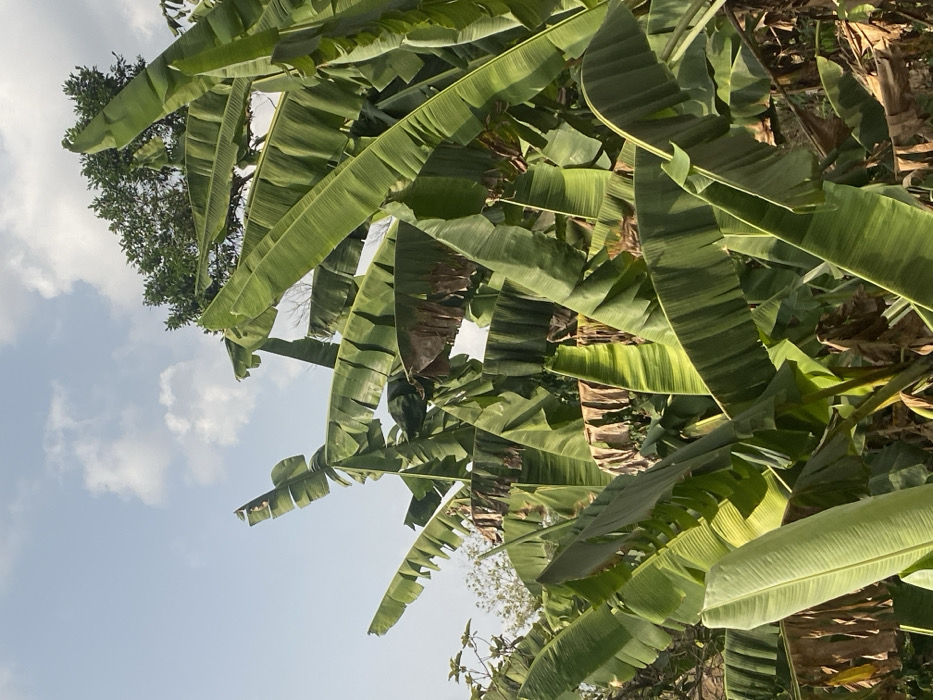 The scene, located in Nguzu Edda, Nigeria, presents a dense natural environment primarily composed of banana plants under a clear sky