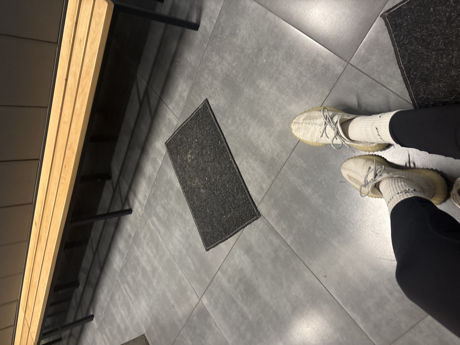 The image depicts an indoor scene, likely a changing room or a common area within a sports facility, given the presence of a bench and the subject's attire. The precise location within Kharkiv, Ukraine, cannot be determined from the visual information provided. The foreground features the lower legs and feet of an individual, viewed from a top-down perspective. The person is wearing black leggings, white ankle socks with dark horizontal stripes near the cuffs, and light-colored (off-white or light beige) athletic shoes with white laces, identified as Yeezy Boost 350 V2 sneakers. The individual's feet are slightly apart and resting on a tiled floor. The floor consists of large, matte grey square tiles with dark grout lines, showing minor variations in tone. A dark grey or black rectangular mat with a coarse, textured surface is centrally located on the floor, positioned approximately between the individual's feet and the bench. In the background, running horizontally across the upper portion of the frame, is a long, narrow bench. It features three light-colored wooden slats as the seating surface, supported by a black metal frame and slender black legs. Behind the bench, a dark, featureless wall or paneling is visible. Lighting appears even, suggesting an artificial light source. No other individuals are present or discernable within the frame.