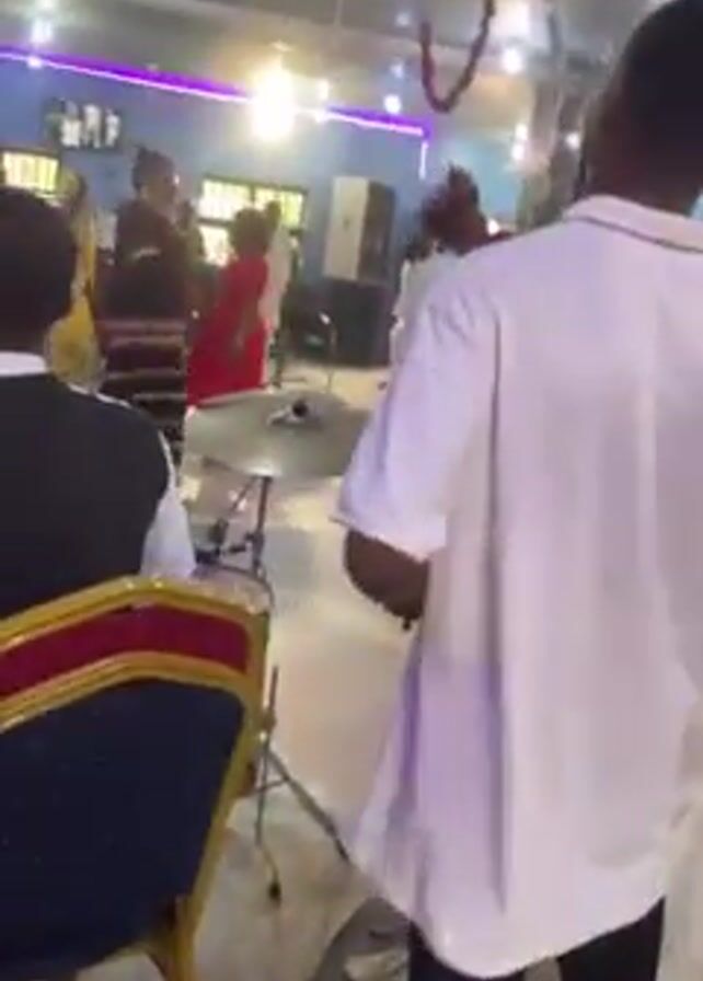 lively gathering, possibly a church service or celebration, with people dressed in a variety of outfits, including traditional attire and more modern styles. There is a band playing in the background, featuring a drummer. People appear to be dancing or moving to the music. The interior space looks like a hall, with decorations and bright lighting. The camera moves around, showing different parts of the room and focusing on the people present.