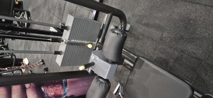 The scene depicts the interior of a fitness facility. In the foreground, a black and grey weight training machine is visible. It features a black padded seat (partially visible), two black padded leg rollers, and a grey adjustment mechanism with a yellow-tipped vertical pin. A stack of approximately 16 grey rectangular weight plates is positioned behind the machine's frame, with a yellow selector pin inserted into one of the lower plates, indicating a chosen weight. The weight plates display numerical markings. Black metal framework constitutes the machine's structure. The floor is covered with dark grey, textured interlocking tiles. In the blurred midground and background, components of additional exercise equipment are present. The lower legs and feet of an individual wearing dark pants and white athletic shoes are partially visible in the mid-background, standing near a red and black braided rope attachment lying on the floor. A vertical poster with a partial image of a human hand against a pink/purple background is visible on the far left. The specific location within the city of Svoge, Bulgaria, cannot be determined from the visual information provided.
