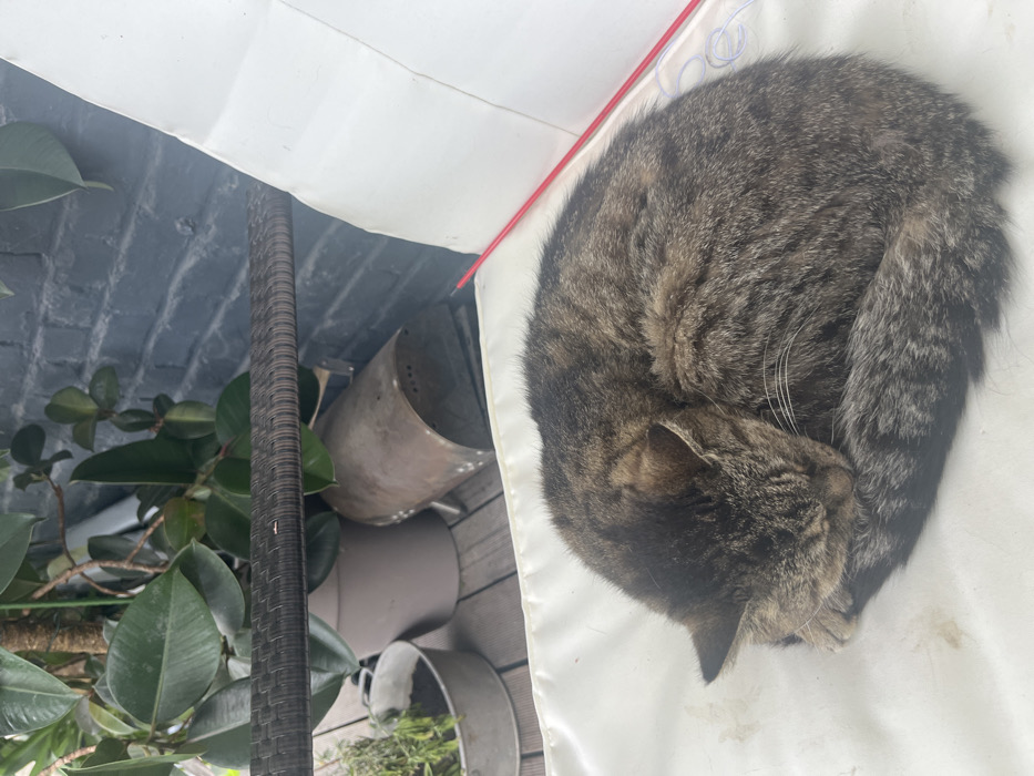 A domestic tabby cat is observed sleeping in a curled position on a white cushion or fabric surface. The animal's eyes are closed, and its head is tucked into its body, with its tail wrapped around its form. Its fur exhibits a striped pattern of brown, grey, and black. The scene is set on what appears to be an outdoor balcony or terrace in Roubaix, France. In the background, a dark brown woven furniture element is visible. Several potted plants are present, including a large plant with dark green leaves in a brown pot and a smaller plant in a grey metal bucket. A rusted, perforated metal half-cylinder object rests on the wooden-planked flooring. A dark grey brick wall is partially visible on the right, alongside a section of white fabric and a thin red stick or wire. The area is illuminated by natural light.