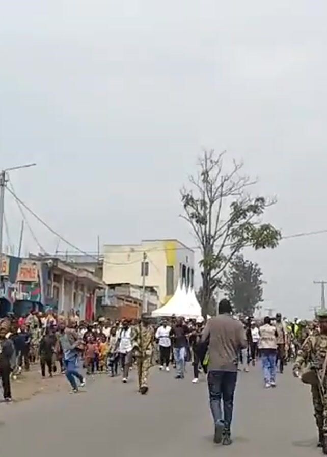wide street in what appears to be a city. A crowd of people are walking down the street, several of whom are wearing military fatigues. One man in fatigues walks toward the camera and has a shoulder strap. Another man in fatigues has a firearm slung over his shoulder. The area has businesses visible with signs and posters. People are gathered around the businesses. Motorbikes are parked on the side of the street. Overhead electrical lines are visible. It appears to be daytime.