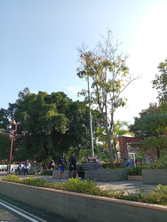 A park scene under a clear blue sky features trees with varying foliage. People are scattered throughout the park, some walking, others sitting on benches. A large tree dominates the left side of the frame, while a more sparse tree stands to the right. A decorative street lamp adds character to the scene. A paved walkway borders a low wall with greenery, creating a visual break between the park and the road.