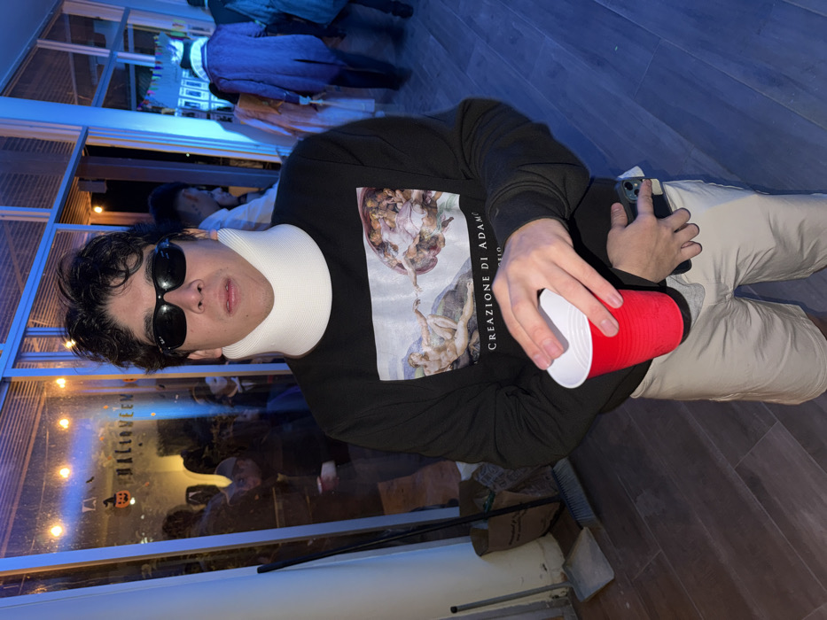 A male individual is depicted indoors at what appears to be a social gathering in Ciudad López Mateos, Mexico. The subject, positioned centrally and facing the camera directly, has dark, wavy hair and is wearing black sunglasses, a white cervical collar, a black long-sleeved sweatshirt featuring Michelangelo's "The Creation of Adam" with text "CREAZIONE DI ADAMO" and "MICHELANGELO", and light khaki shorts. He holds a red plastic cup in his left hand and a dark-cased smartphone in his right hand, positioned near his hip. His mouth is slightly agape. The background on the left features a large glass partition or window with reflections and silhouettes of blurred figures, some appearing to be in costumes. The word "HALLOWEEN" is visible on the glass, accompanied by orange string lights. A broom, dustpan, and a brown container are situated on the floor near a white wall to the far left. The background on the right, also through a glass partition, shows additional blurred figures, including one dressed in a blue long coat and white headwear, indicative of a costume. This area is illuminated with a distinct blue light. The flooring throughout the visible area is dark-toned wood or tile.