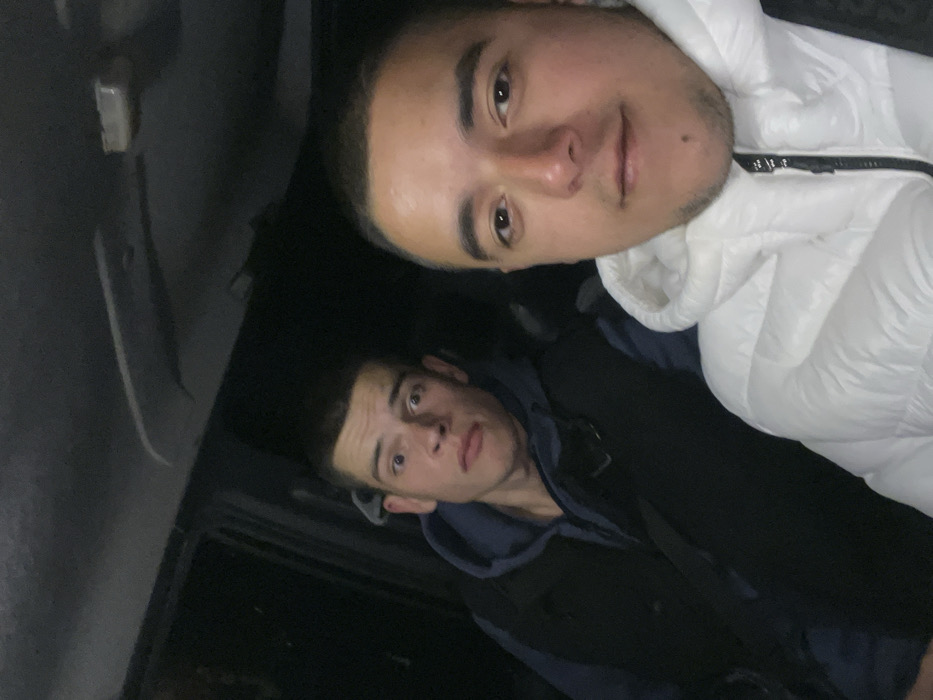 The scene, depicted as occurring within a vehicle in the city of Sopot, Bulgaria, features two adult males under low light conditions. The individual in the foreground, positioned on the right, has short dark hair, light brown eyes, and a small mole located on his chin. He is wearing a white hooded puffer jacket with a prominent black zipper and displays a neutral facial expression, appearing to be the subject taking the self-portrait. Seated behind and to the left of him, the second individual, also with short dark hair and light-colored eyes, exhibits a wide-eyed, open-mouthed expression. He is dressed in a dark blue hooded sweatshirt layered beneath a black vest. The vehicle's interior is dark, with only indistinct elements of the ceiling and upper window frames partially visible, offering no specific identifying details about the vehicle model or its immediate surroundings. The time of day appears to be night or a similarly dimly lit environment.