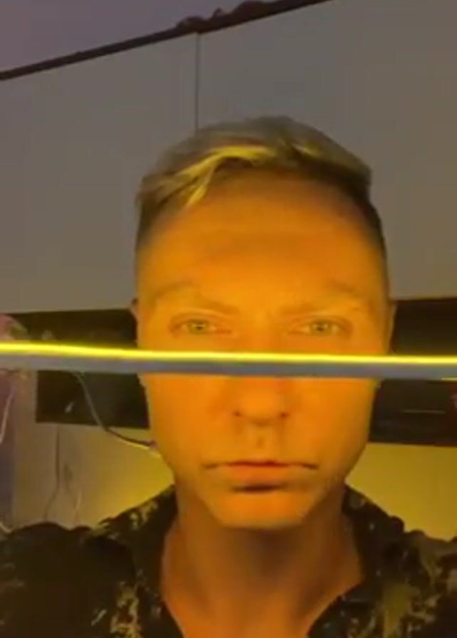 A man with short, blonde hair is standing in front of a camera. He is wearing a black shirt with a yellow design. A long, thin, yellow light is held in front of his face, between his eyes and mouth. He is looking directly at the camera. He smiles slightly. There is a cabinet and some equipment in the background. Upbeat music is playing.