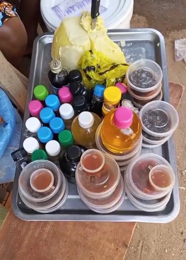 silver tray on a rough wooden surface that holds an assortment of items for sale. A large block of off-white shea butter with a knife stuck in it is in the back left corner. To the left of the shea butter are small bottles with colored lids: pink, white, blue, and green. Next to them are several black bottles, followed by large bottles of yellow oil. Small clear plastic containers with a red-brown liquid are arranged in several stacks on the right side of the tray. Some have small attached cups on top. A white plastic bucket is visible in the upper left of the frame, behind the tray. A person’s legs and patterned skirt are partially visible next to the bucket.