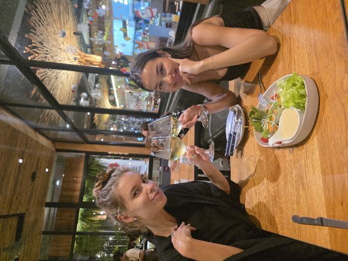 Two adult females are seated at a light-colored wooden table inside The Garden Restaurant Phuket in Phuket City Municipality, Thailand, during an evening setting. Both women are light-skinned and smiling towards the camera. The female on the left, with light brown hair in an updo secured by a clip, wears a dark, long-sleeved top and holds a wine glass containing light-colored liquid in her raised left hand. The female on the right, with long dark hair worn down, wears a dark sleeveless top and holds a similar wine glass in her raised right hand; her left hand rests on her chin. Their wine glasses are clinking together, indicating a toast. On the wooden table, a white oval bowl contains a green salad with lettuce, sprouts, and sliced vegetables, accompanied by a small container of dressing. A black-handled knife is positioned on the lower left of the table, and a small white plate with stacked cutlery (fork and knife) is near the center. The background features large glass windows displaying blurred outdoor palm foliage and illuminated Christmas/holiday decorations, including white snowflake decals and cartoon Santa figures. Inside, a distinctive, large, tree-like sculptural element constructed from light-colored wooden sticks rises towards the ceiling, from which silver spherical ornaments are suspended. Other blurred patrons are visible in the distance.