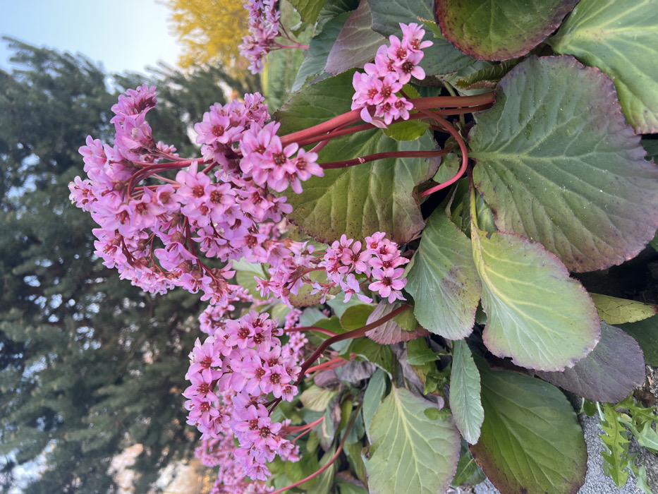 The image presents a close-up view of blooming Bergenia plants in a cultivated outdoor area within Ljubljana, Slovenia. Multiple clusters of small, five-petaled pink flowers with reddish-pink centers are prominently featured on thick, reddish stems. Beneath the blossoms, large, ovate leaves display a primary green color with significant reddish-purple pigmentation along their edges and undersides. The lower-left foreground reveals a segment of a light gray, textured surface, possibly concrete, partially obscured by sparse green groundcover. The background, rendered out of focus, includes dense dark green coniferous trees on the left and center, and a patch of bright yellow-flowered vegetation on the right. A clear, light blue sky is visible at the top. No individuals are present.