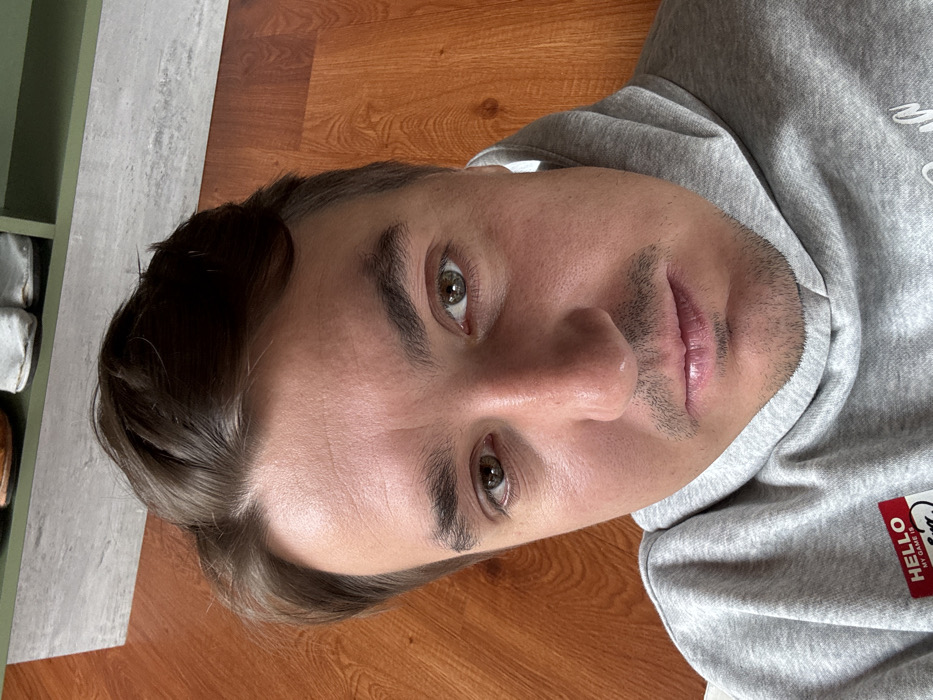 A man lies on his back with his head angled upward. He has short, dark hair, fair skin, and light brown eyes. He wears a gray hooded sweatshirt with a red name tag reading "HELLO MY NAME IS." The background consists of a wooden floor and a green cabinet with white and brown items inside.