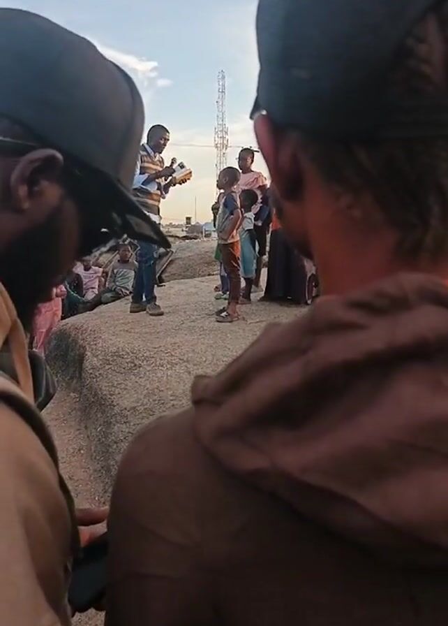crowd gathered on a rocky, possibly elevated area. A man in a vest and jeans is standing in front of a group that includes children and women, seemingly speaking into a microphone. He appears to be interacting with them. Some people are seated to the side, observing. Two individuals with their backs to the camera frame the view, both wearing baseball caps and hoodies. One has a backpack placed near them. In the background, there's a telecommunications tower. The sky is visible and a clear blue with some clouds.