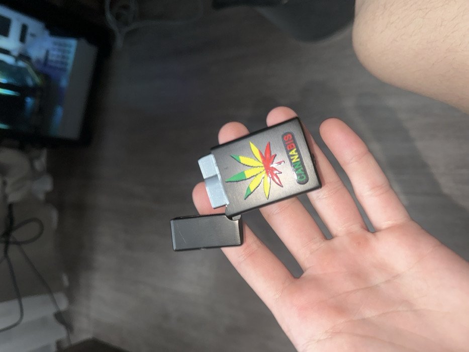 The image displays a close-up view of a light-skinned human hand holding a black, rectangular lighter or lighter case. The object is open, revealing two silver-toned internal components. The front surface of the object features a stylized cannabis leaf design in green, yellow, and red, with the word "CANNABIS" printed below it in corresponding multicolored letters. Minor scratches are visible on the object's matte black finish, particularly on its hinged top cover. The hand, likely a left hand with the palm facing upwards, appears to belong to an adult. The background indicates an indoor environment. Dark grey or brown laminate flooring is visible in the foreground and mid-ground. In the blurred background, elements include dark cables on the floor, a portion of a white curtain or fabric to the upper left, and a partially visible computer tower with internal blue and green illumination on the upper right. A segment of a bare human leg is visible in the lower right, suggesting the individual holding the object is seated. No specific visual cues are present within the image to definitively identify the location as Hrodna, Belarus; however, the scene is consistent with a modern indoor residential or personal office setting.