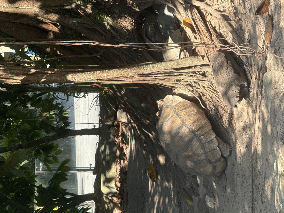 The image depicts an outdoor enclosure within Zoo Negara Malaysia, located in the Ampang Jaya Municipal Council area. A large, light brown tortoise, characterized by a segmented, ridged shell, is positioned in the left foreground, oriented towards the right. It rests on a sandy dirt ground scattered with dried leaves and small rocks. Extending from the midground to the right, a large tree with a thick trunk and numerous aerial roots partially shades the area. Partially obscured by these roots in the right midground, two additional tortoise shells or inactive tortoises are visible. In the background, a clear, vertical barrier separates the enclosure from a lighter-colored paved surface, beyond which green foliage and tree trunks are visible. The scene is brightly illuminated by direct sunlight, creating strong shadows across the ground and subjects.